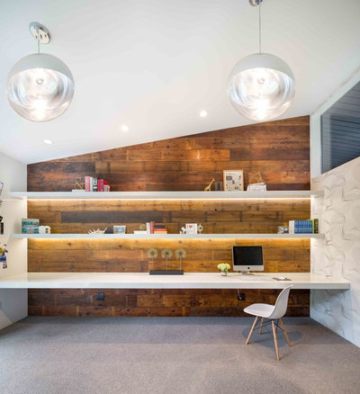 При варианте, когда поверхность встраивается между шкафами, визуально правильно делать ее именно на ширину шкафов (или буквально чуть шире, и то в случае крайней необходимости). Если же это просто место для ноутбука, а не для огромных чертежных листов, смело жертвуйте функцией в угоду эстетике. Кроме того, те, кто действительно ежедневно нуждается в большом рабочем пространстве, обычно предпочитают свободностоящие столы с регулируемой высотой столешницы.